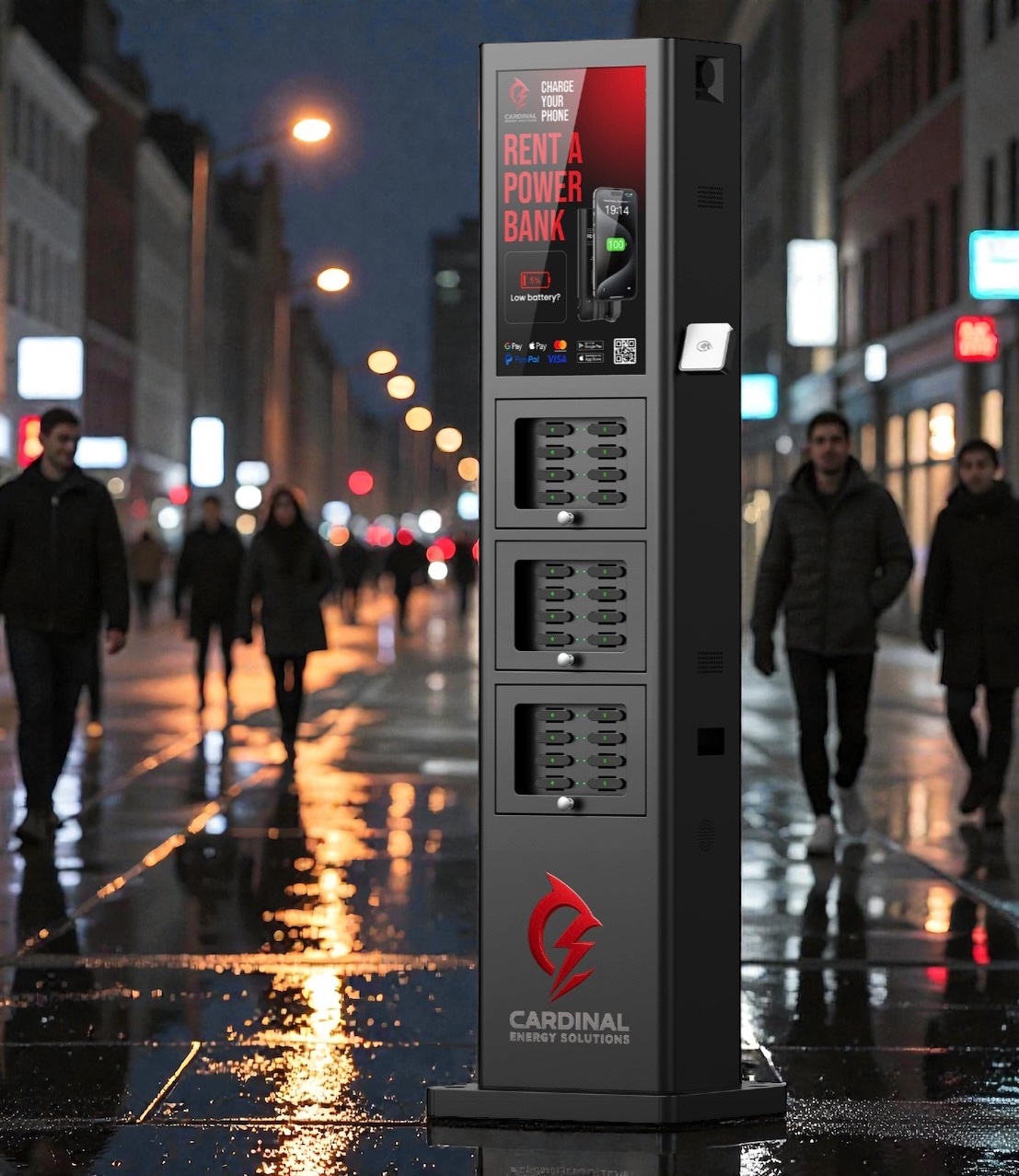 Rather than relying on wall outlets or fixed charging stations, Cardinal Energy Solutions deploys freestanding charging towers paired with portable power banks.