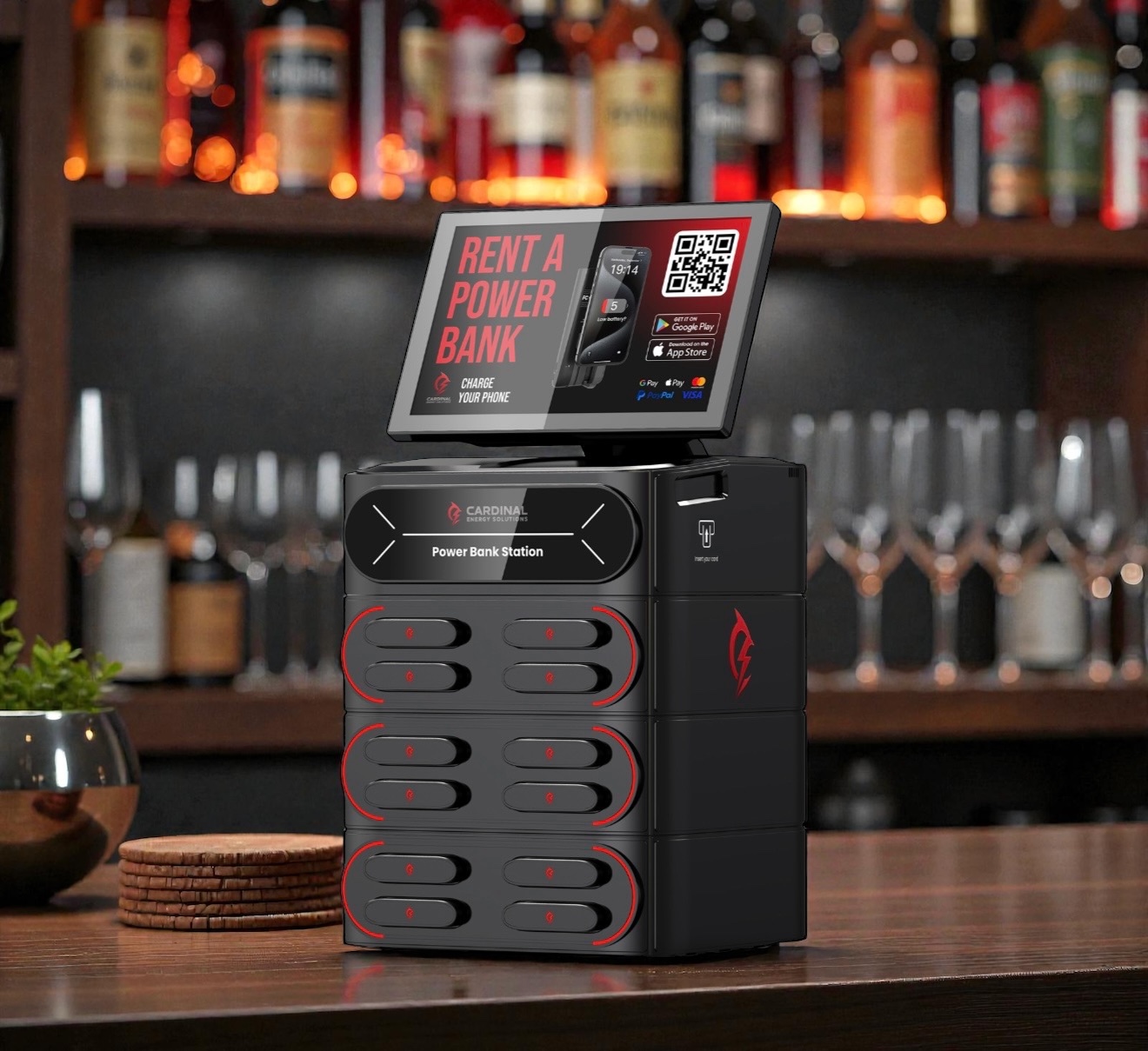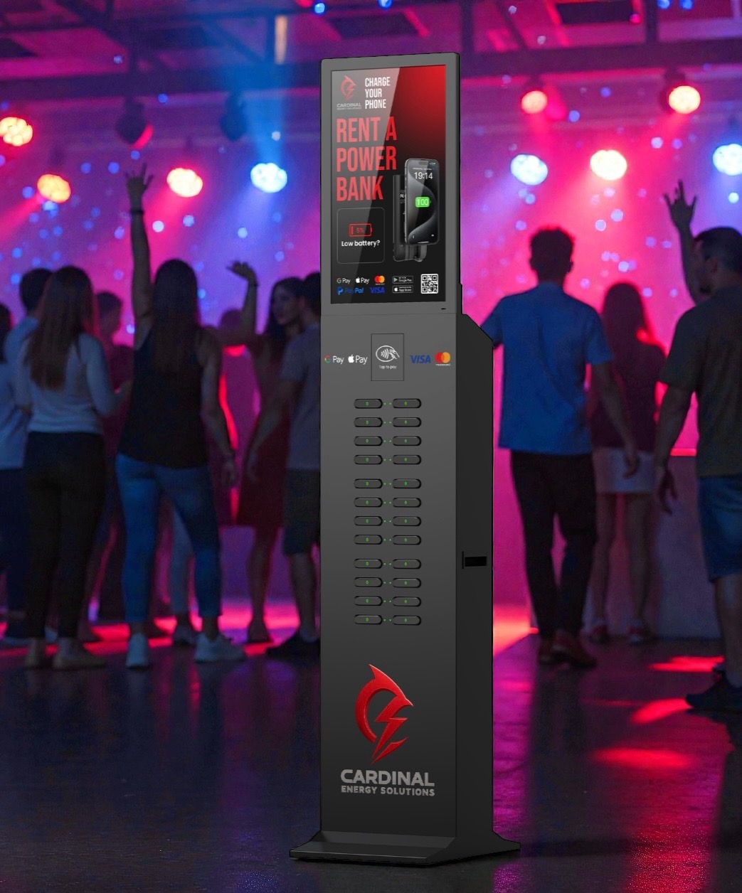 Cardinal Energy Solutions deploys freestanding charging towers paired with portable power banks that guests can carry throughout your space.